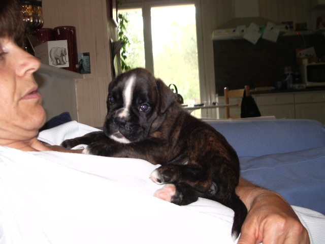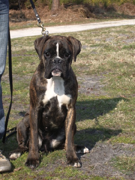 6 * CACIB BORDEAUX SPECIALE BOXER 18 janvier 2009 - classe JEUNE - juge MARTNEZ PEREZ (espagne) "20 mois, bringée foncée, trés belle expression, trés bonne position des yeux avec bonne encolure et forme, museau plein, prognathisme correct, denture moyennement large, Excellente structure générale, TB angulation avant, EXC angulation arrière. EXC dans le mouvement pleine de force arrière"